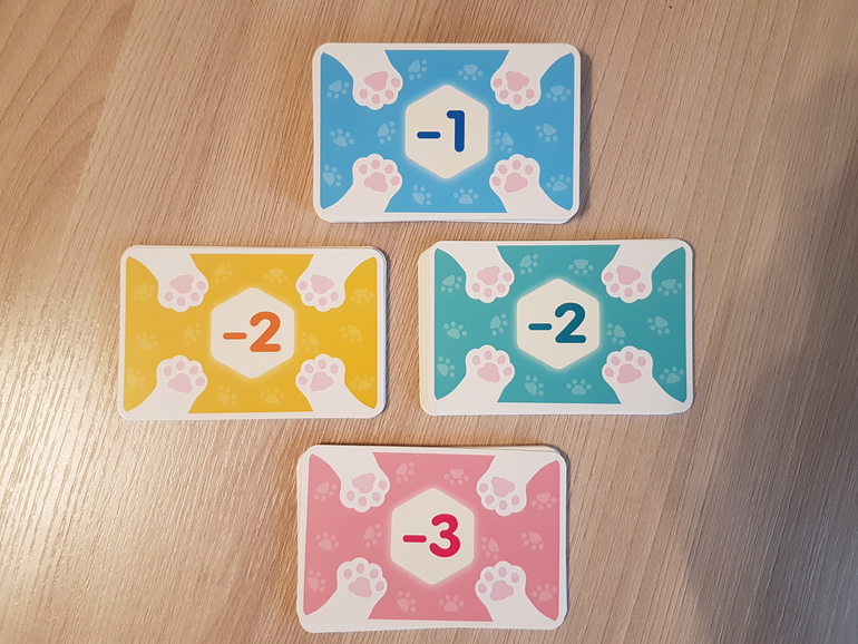 Как только один игрок выполнил задание, он кричит "Мяу!" и выставляет вперед свою "лапу", сжатую в кулак (инструкция говорит нам, что это жест "кота удачи"). Остальные игроки тут же должны ему ответить - стукнуть своим кулачком по его. Тот, кто сделал это последним, тут же переворачивает свою карточку с заданием рубашкой вверх, то есть получает штрафные очки, указанные на рубашке (в первом уровне -1).