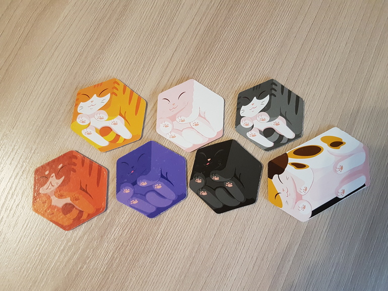 Давайте скорее выпустим их. Итак, котики представляют собой шестиугольные тайлы (из очень плотного картона) разного цвета и окраски - 4 комплекта по 7 шт (по комплекту на каждого игрока).