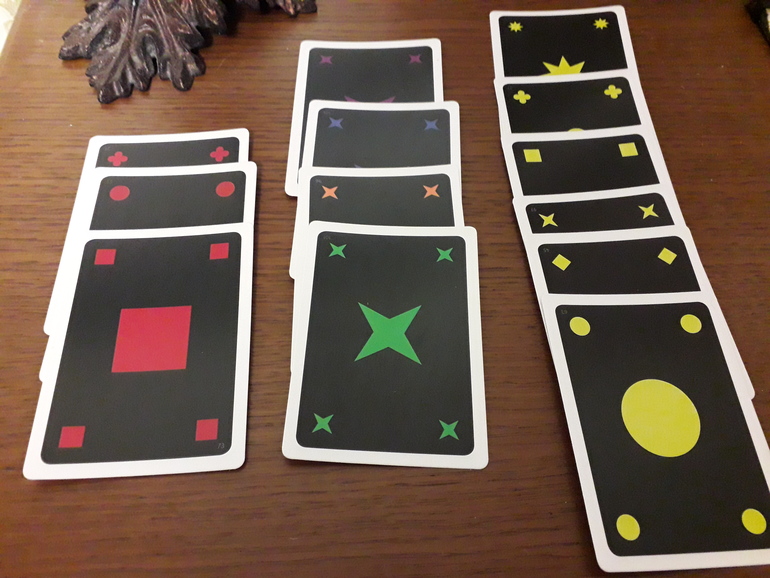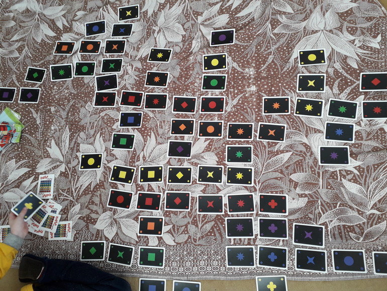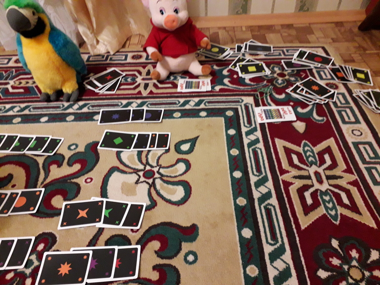 Основной принцип игры-выкладывать карты так, чтобы в каждой группе были карты с разными геометрическими фигурами одного цвета (без повторов), либо карты с одной геометрической фигурой, но разного цвета.