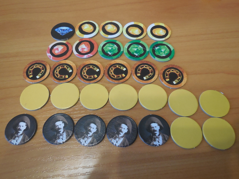 Компоненты игры вполне симпатичные и качественные: пластмассовые фигурки игроков, кубик, камешки - алмазы же ;-), а также жетоны - пустышки, подковы, драгоценные камни - рубины, изумруды, сапфиры, и, собственно, жетон алмаза, который все и будут искать.