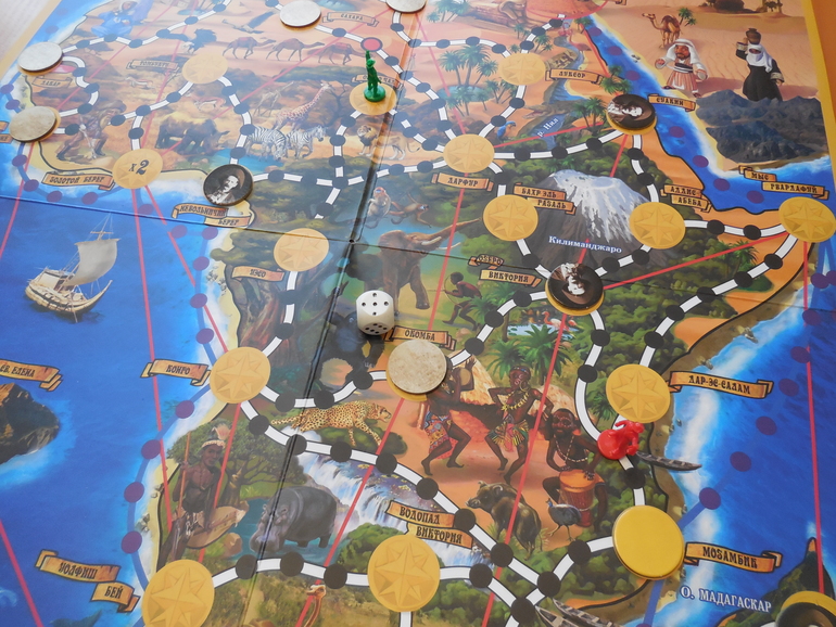 Та-даааам! Вот такая игра. Довольно увлекательная. Такая усложненная ходилка с приключениями, драгоценными камнями, счетом денег, и погонями. Заодно знакомство с Африкой и ее африканскими нравами ))) На игре указано 4+. Ну, не знаю, как в 4, но в 5 можно играть вполне. Там надо считать уметь, ну или с подсказками. Рассчитана на компанию до 4-х игроков.