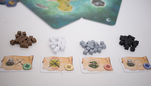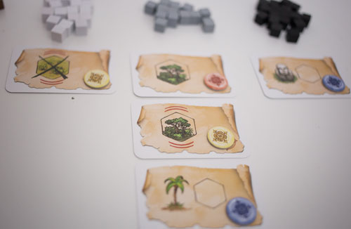 Карта сокровищ представляет собой последовательность выложенных игроками карт-ключей, каждая из которых постепенно сужает круг поиска. При подготовке к игре один из игроков выложил карту-ключ в фонд серого сокровища, информирующую, что клад зарыт в джунглях. Следующий игрок выложил карту-ключ, которая сузила поиск до сокровищ, лежащих в самых больших джунглях. Третья карта-ключ подсказывает, что нужно копать недалеко от пальмы. И так далее, пока сокровище не будет найдено.