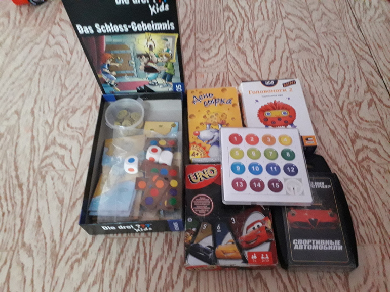 Летом собрались мы с дедушкой в отпуск. В Питер да в Москву. В дорогу разжилась карточными играми. Ещё в кадр не попал шарик-аналог Орбо. Его тоже брали, сын до сих пор любит, щёлкает.