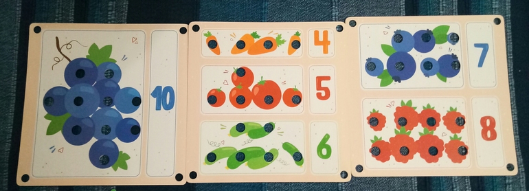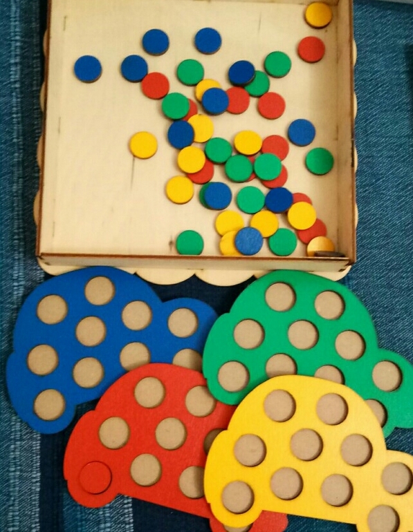 Фишки в наборе трех размеров, младший пока больше любит выталкивать с обратной стороны)