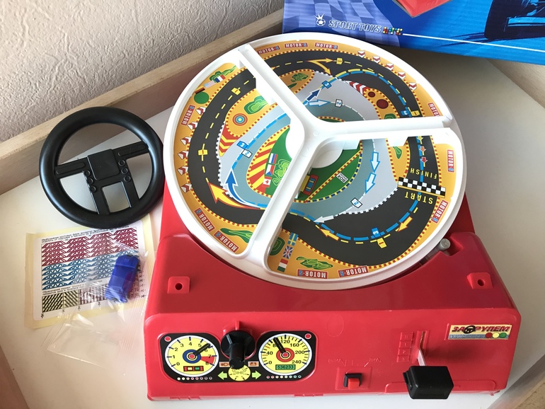 Магнит очень слабый, машинку быстро теряет. В игре 4 скорости, взрослому человеку на первой играть сложно, что уж говорить о ребёнке 4-х лет. Руль крутится отлично. На машинку надо клеить наклейки, они в комплекте. Машинка одна.