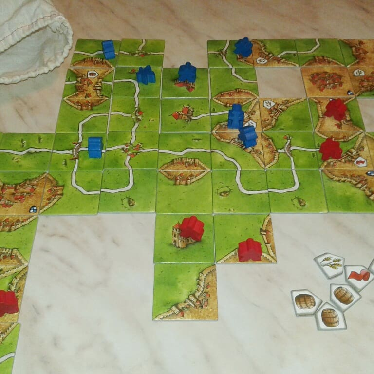 Помимо новых интересных тайлов местности добавляются жетоны товаров: зерно, вино и ткани. Эти же символы есть и на некоторых городских тайлах. И, как только кто-то завершает город, он получает по одному жетону за каждый такой символ в этом городе. Причём игроку даже не обязательно иметь в этом городе рыцаря. Эти жетоны будут учитываться в конце игры, принося по 10 очков тому, кто набрал больше товаров каждого вида. Ну, а тот, у кого в закрытом городе преимущество по миплам, получает свои законные победные очки. Вот такое интересное нововведение!