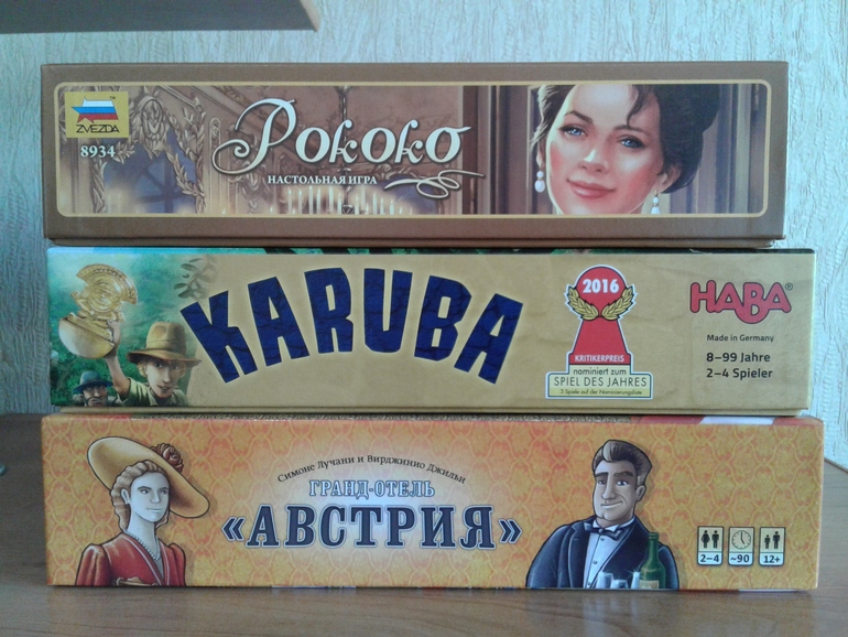 Гранд-отель Австрия - увидела здесь в сообществе, полезла читать правила, посмотрела видео Beznalа - понравилась. Несколько дней назад приехала коробочка, разложила я партию одна за двоих, чтобы разобраться - и затупила. Когда видео смотрела все казалось легко и понятно, а тут не могла сориентироваться, какие карты лучше брать, в каком порядке выгоднее действовать. Следующую партию играла по соло правилам с BGG, вообще загнала себя в тупик. Расстроилась, что зря купила. Сегодня опять разложила за двоих - на ночной стороне, она легче и тут стало получатся, комбинации и даже по шкале императора не пролетела. Может карты и кубики выпадали удачнее, может я разобралась, но ощущения от игры совсем другие. Не жалею о покупке) Художественное оформление, возможно, на любителя, но меня не напрягает, в процессе игры на рисовку вообще внимания не обращаешь, все мысли о другом. Сама игра качественная, тактильно приятная.