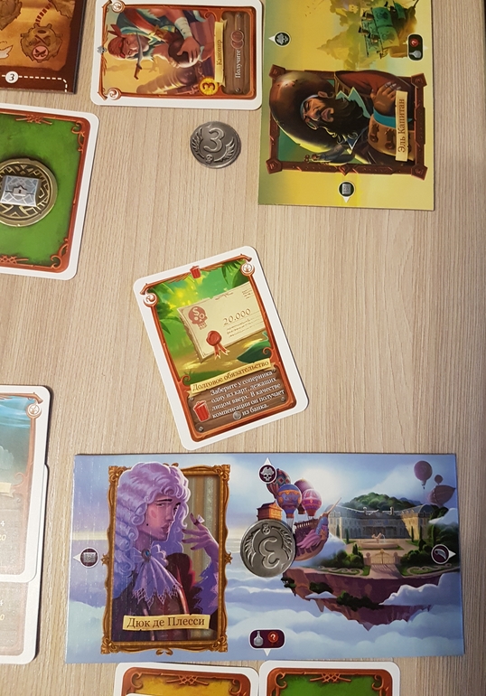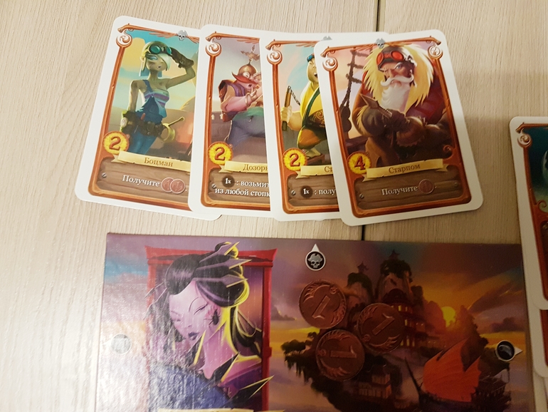 Больше трех карт в стопке быть не может. Если игрок посмотрел три, но брать их не хочет, то кладет обратно, но вместо четвертой карты добавляет монету. Тот, кто решит забрать эту стопку, заберет и все монеты, что на ней.
