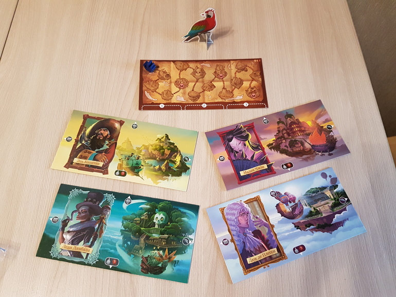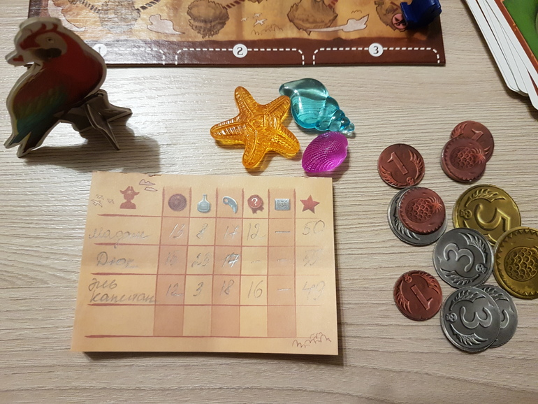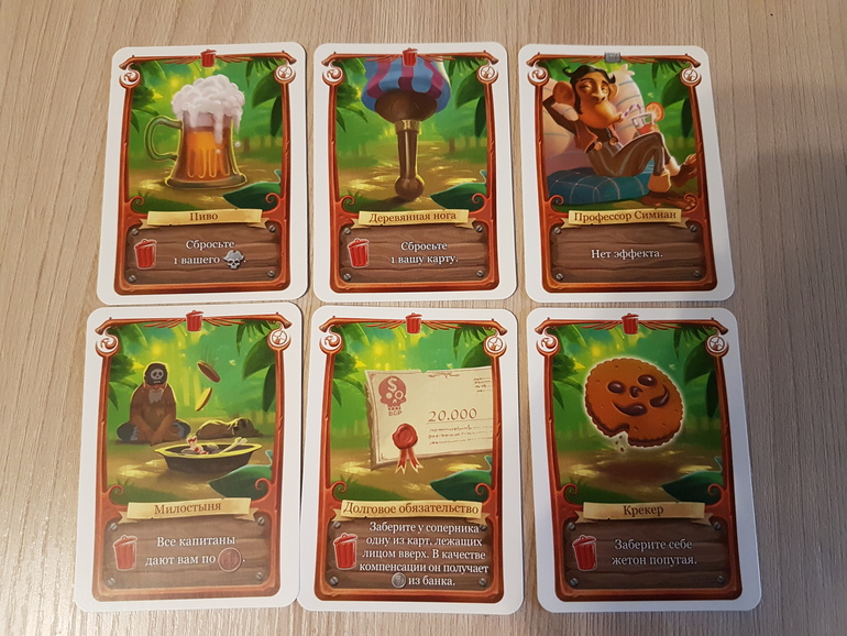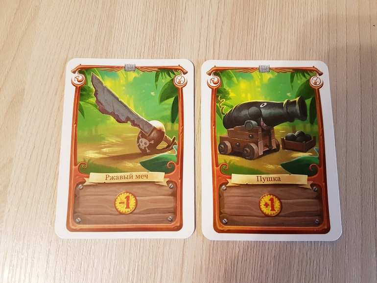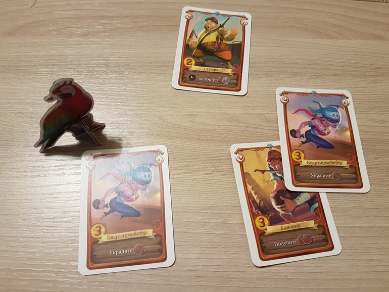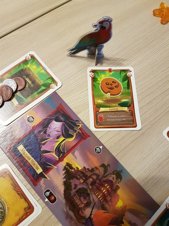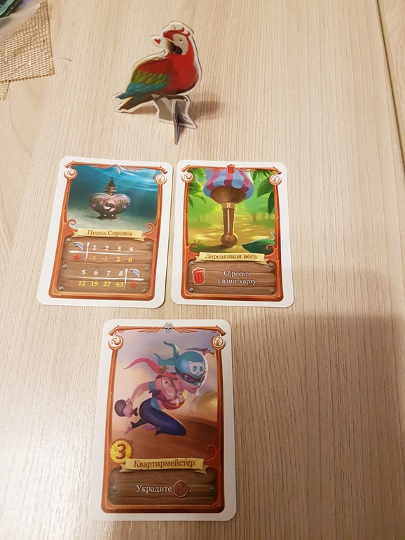 Из минусов отметила бы только картонную ножку попугая, которая выпадает, если его поднять, но это решаемо, можно приклеить (и не так уж часто попугая в игре надо поднимать). И необходимость очень тщательно перемешивать карты перед началом партии, собственно как и в большинстве карточных игр.