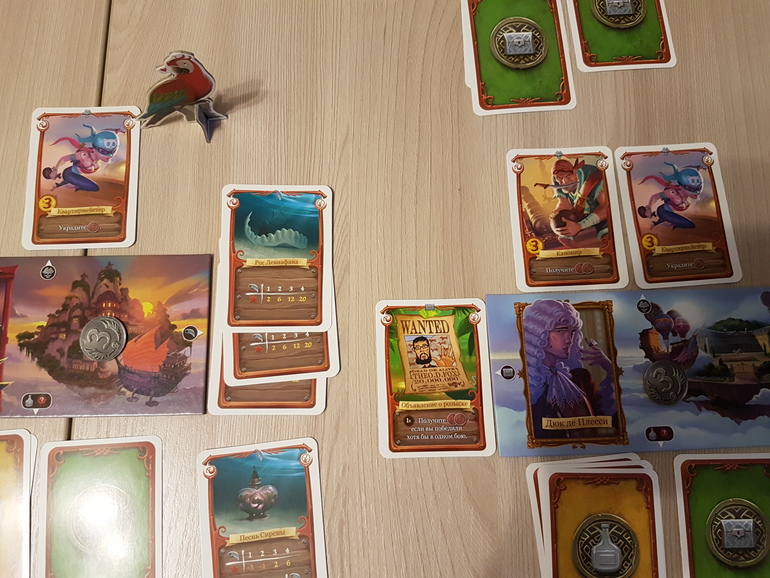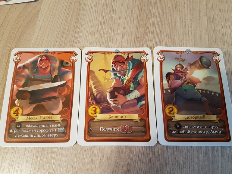 Соответственно, де Плесси выиграл оба боя (с каждым из соперников), он дважды применяет свойства своей команды (написаны на картах, в данном случае получает деньги из банка и крадет по монете у соперников), мадам Чжэн обкрадывает только Эль Капитана как более слабого, а сам Эль Капитан не получает ничего (закрылся в капитанской каюте и кроет на чем свет стоит отборной пиратской бранью свою слабую команду).