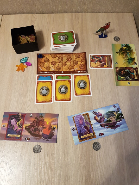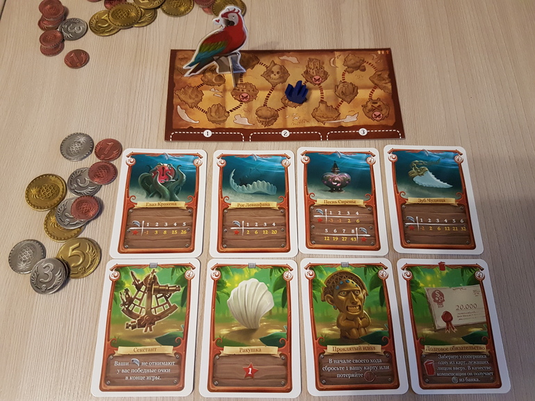 Это было небольшое лирическое вступление, чтобы немного погрузить вас в атмосферу игры. Рисунки на картах и планшетах, на мой взгляд, очень красивые, монеты создают впечатление настоящих (хотя они картонные). Попугай, шляпа и кораблик придают объем карточной по сути игре (на сбор сетов, как мы любим). Поле и корабль - это счетчик раундов, планшеты - всего лишь указатели расположения набранных карт, шляпа - маркер первого игрока, но вместе все выглядит очень привлекательно, в том числе для детей. Игра семейная, правила объясняются и запоминаются быстро, символы на картах понятные, есть поясняющий текст.