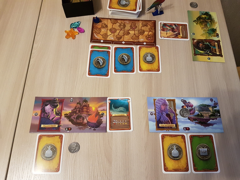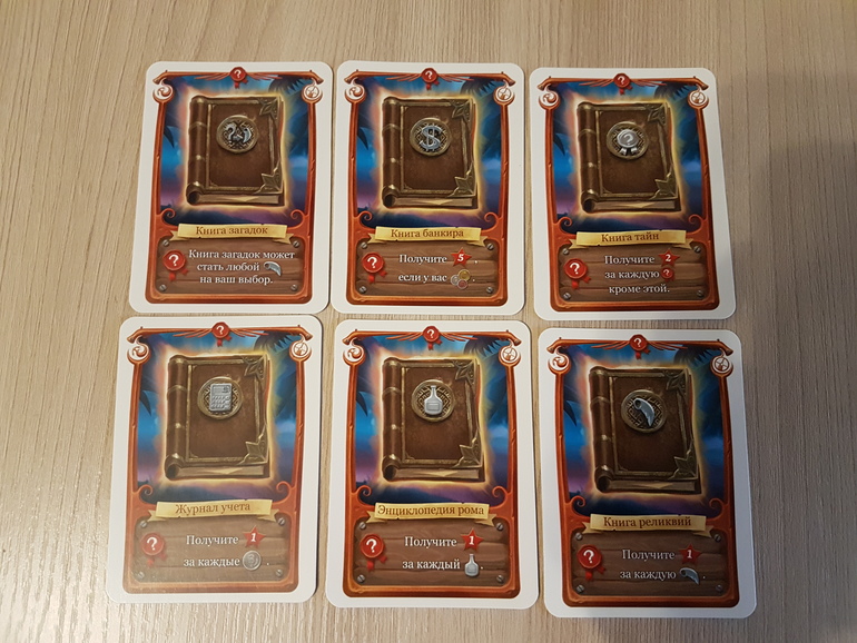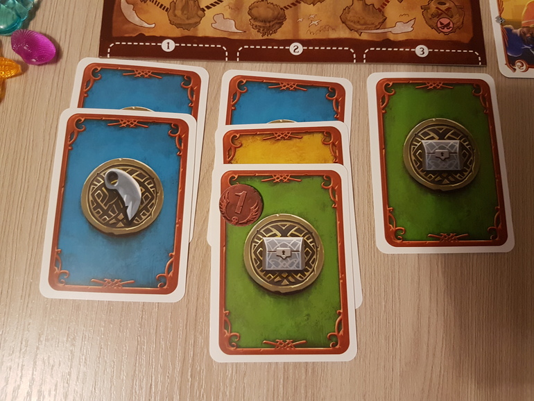 Полученные карты располагаются вокруг планшета игрока определенным образом - ром и карты с тайнами под планшетом рубашкой вверх, остальные видны соперникам. Реликвии (справа) желательно собирать одинаковые - чем их больше, тем больше очков они приносят. Некоторые реликвии приносят минусовые очки, если у игрока только одна или две таких карты.