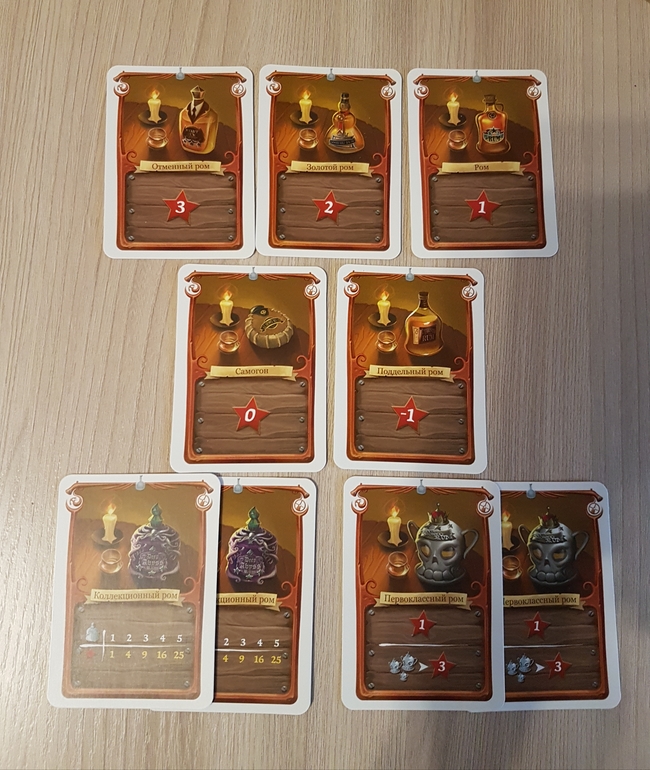 Ну и какой пират не любит ром! Без него не обходится ни одно путешествие. Иногда удается добыть хороший ром, даже коллекционный, иногда - так себе, а бывало, что попадался самогон или вовсе подделка (всего 21 карта рома с желтой рубашкой. Звезды на картах - это победные очки).