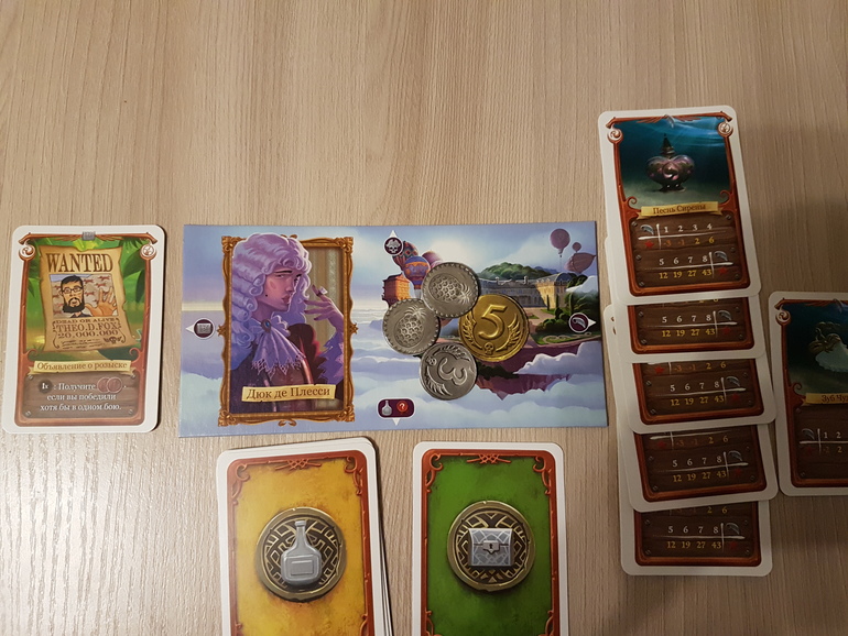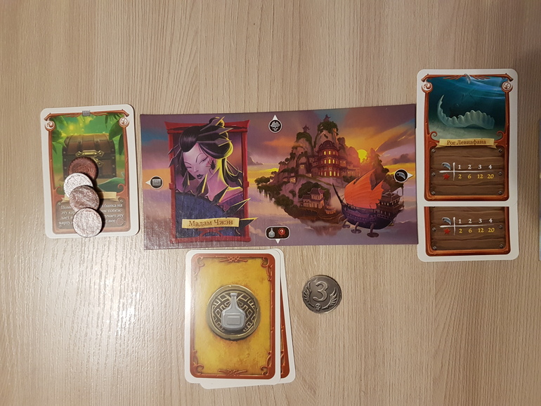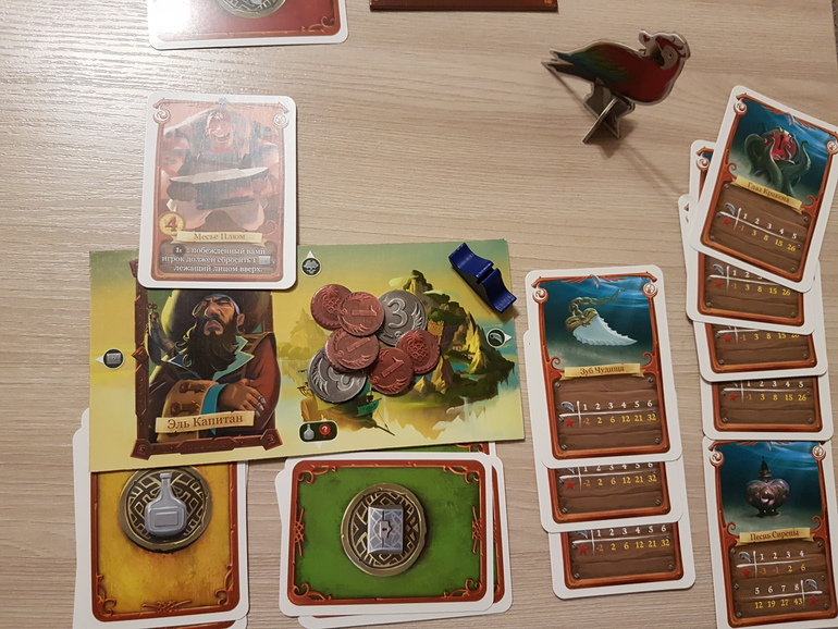 Иногда в стопке карт вместе с полезными попадаются и совершенно невыгодные карты. Можно их не брать, но в таком случае упустишь и что-то нужное. К примеру, наша мадам, желая нанять хотя бы кого-нибудь в команду, взяла воинственную леди, а в придачу деревянную ногу, которая предписывает сбросить одну карту (бывает, что все карты нужные, жалко сбрасывать, но что поделаешь). И флакончик с песнью Сирены весьма опасен - в количестве одной или двух карт у игрока он отнимает очки (отыгрывая деревянную ногу, можно сбросить например его, если игрок такие карты не собирает).