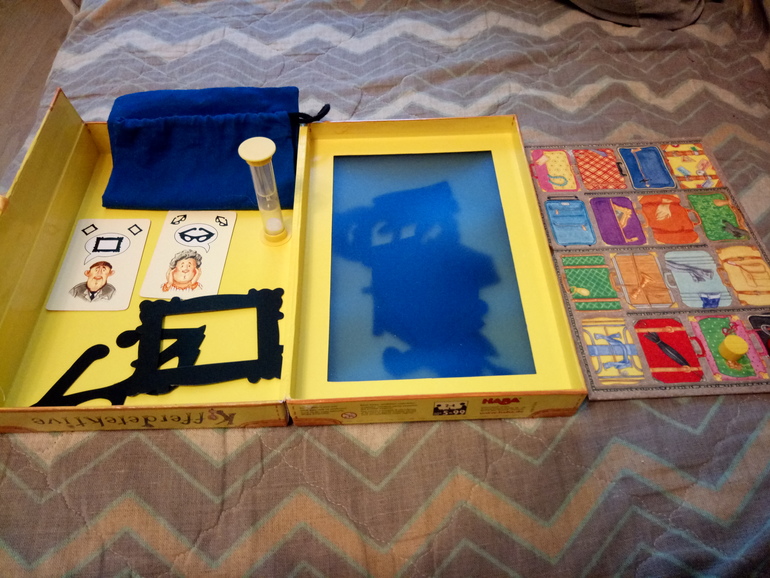 В чемодане 8 предметов. У каждого игрока 8 карт. По очереди игроки становятся воришкой. Воришка крадёт из чемодана 2 предмета и трясет чемодан, чтобы перемешать оставшиеся вещи. За отведенное время по очертаниям оставшихся предметов игроки должны узнать, что украдено. Очки засчитываются по количеству отгаданных вещей. Игра простая, но интересная. Можно усложнять, увеличивая количество угадываемых предметов. У нас ещё всегда воришка отдельный человек, который не участвует в игре.