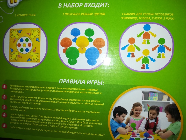 игра "Улетные прыгуны". Суть в том, чтобы ловить прыгунов(они на пружине с присоской) и собирать пазл в виде человечков по определённым правилам. Правила игры на обратной стороне коробки.