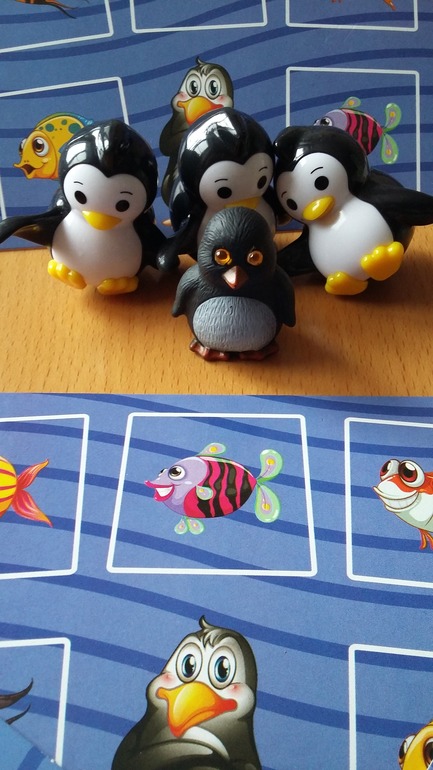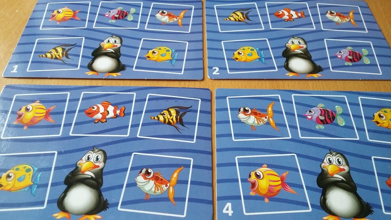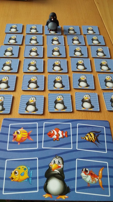 Карточки в игре раскладываются определенным образом в 5 рядов. И каждый игрок ходит за пингвиненка Тяпу влево-вправо, вверх и вниз на один жетон в свой ход и ловит рыбу . Пингвин после хода, остается на том месте где была рыбка. По диагонале, ходить нельзя. На планшетах рыбки отличаются, не не на много.