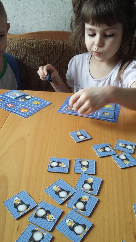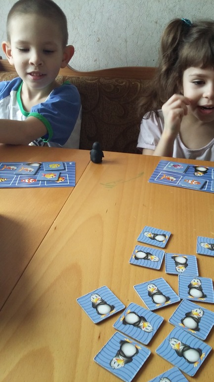 Еще покажу наши хоумрулы откорректировпнные для ребенка 2.5 лет. Пингвин как ребенок взял в свои пальчики, так его забрать во время игры другому игроку не представляется возможным, поэтому пингвинов увеличили по количеству участников. Ну и таких стройных рядов пока у нас не получается. И ребенок просто берет понравившиюся карточку где думает будет рыбка. Для разнообразия это хорошая игра и есть уже тактильный пингвин, которого дети очень любят.