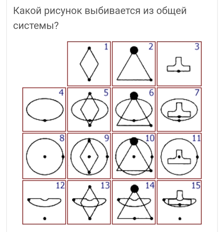 Верхний ряд содержит элементы, которые повторяются во всех остальных рядах. Левый столбец содержит элементы, которые повторяются во всех остальных столбцах. И только рисунок 11 не полностью повторил элементы с верхнего ряда.