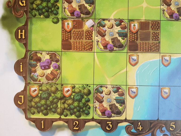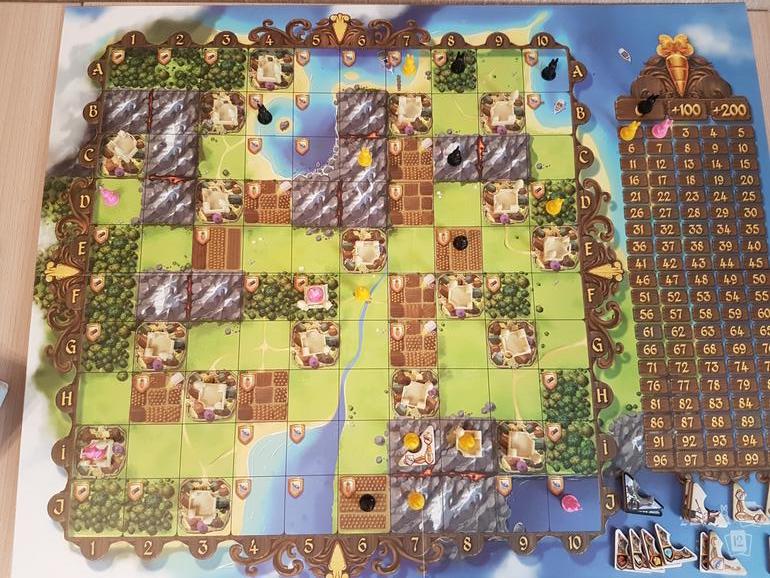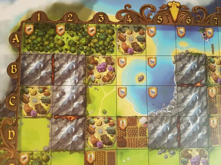 Большое поле, которое хозяйственные кролики разделили на квадраты и каждый обозначили буквой и цифрой. Справа шкала престижа и процветания подсчета очков.