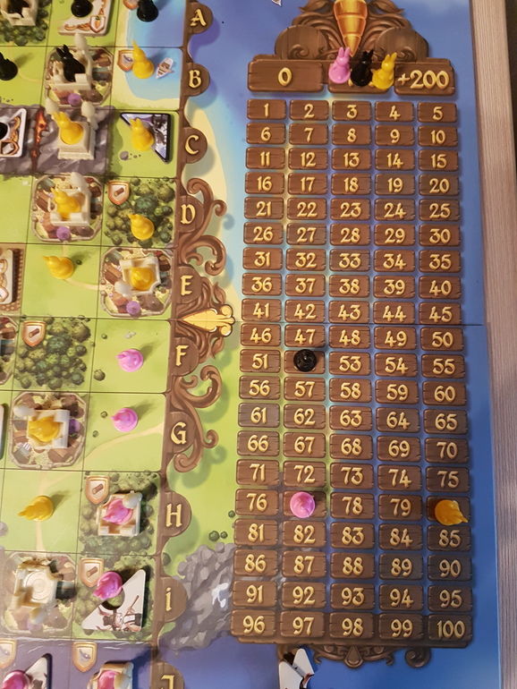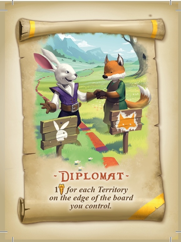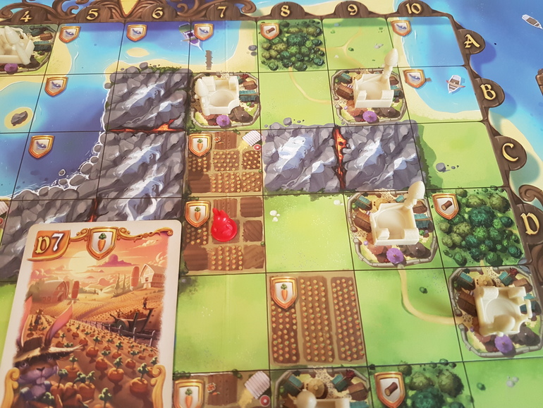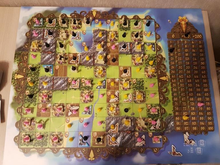 Несмотря на то, что каждый игрок разыграл 12 карт, создать большие и прибыльные феоды пока не получилось. Никто ведь не гарантирует, что попадутся карты с "нужным" адресом (рядом с теми клетками, где уже стоят ваши кролики, а именно так выгоднее расставлять своих подопечных - рядом), не факт, что получится построить город или ферму (и желательно в одном феоде). А свитки вообще могут изменить всю вашу стратегию - к примеру, чтобы получить очки в конце игры вы можете занимать клетки на краю поля, или селить кроликов в леса (условия получения ПО), или создавать как можно больше маленьких феодов, или наоборот один большой (карт свитков в колоде много, соответственно условий получения ПО тоже). Каждая игра будет не похожа на предыдущую, в каждой партии вы получаете на руку совершенно разные карты и используете их по-разному, реиграбельность достаточно высокая.