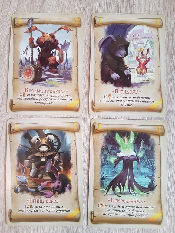 А в чем, собственно, смысл? Понятно, что выиграет тот, кто наберет больше очков. А набираем их так - объединяем поселения кроликов в феоды (в правилах есть подробное объяснение, что считать феодом, если кратко - соседние клетки, занятые вашими кроликами), а затем собираем в каждом феоде урожай (=победные очки), которые получаются умножением силы феода (то есть количества башенок в городах) на его богатство (количество РАЗНЫХ ресурсов на этой территории). Это третья фаза - фаза урожая. К примеру, феод, в котором есть 2 башни (сила равна двум) и 4 разных вида ресурсов (богатство равно четырем) принесет 8 очков.