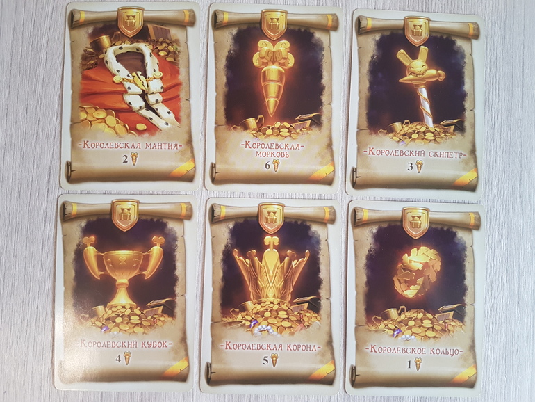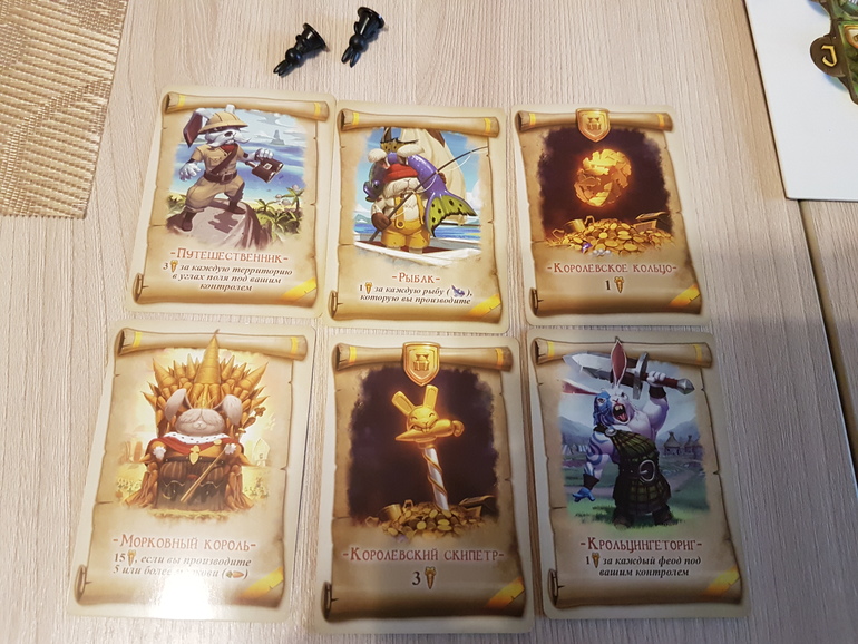 Среди них есть те, которые просто приносят определенное количество очков (кольцо, скипетр), и есть те, которые приносят очки при выполнении определенных условий. Например, на фото ниже рыбак приносит по 1 очку за каждую рыбу, которую производит игрок, а морковный король принесет 15 очков, если игрок возделывает 5 или более морковных полей. И т.п.