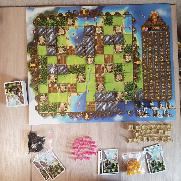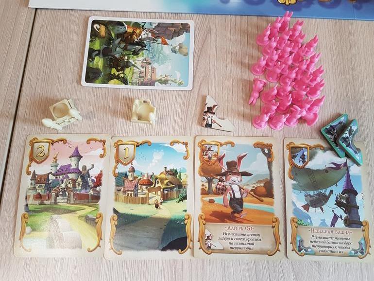 Чуть подробнее о процессе. Возле поля с изображением кроличьего королевства ставим замки (часть уже выставлена на поле по правилам игры) и кладем жетоны ферм и лагерей. Каждый игрок получает кроликов своего цвета и выставляет по одному на шкалу подсчета очков (справа). При игре втроем игроки получают по 12 карт (вчетвером по 10, правила игры вдвоем немного отличаются, о них позже). Всё! Это вся подготовка к игре, занимает буквально пару минут.
