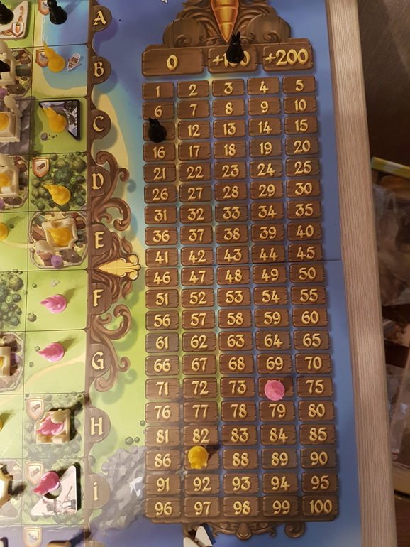 Так вот - очки может принести практически все, главное - правильно распорядиться пришедшими в руку картами. Если не приходит нужная карта территории, можно выставить лагерь. Небесные башни помогут объединить отдаленные феоды, чтобы суммировать количество башен и видов добываемых ресурсов в них. Заняли пустую клетку? Постарайтесь поставить ферму или башню. А уж свитков с условиями получения очков в колоде много, всегда можно выбрать, к чему стремиться, на чем заработать.