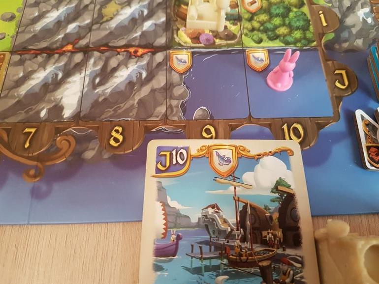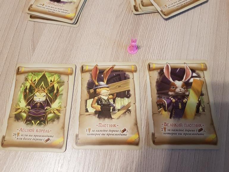 Розовые кролики очень удачно занялись заготовкой древесины. Игрок собрал в руках 3 схожих карты - лесной король, плотник и великий плотник (в течение партии старался занимать клетки с лесом, соответственно) и получил в конце игры более 40 очков.