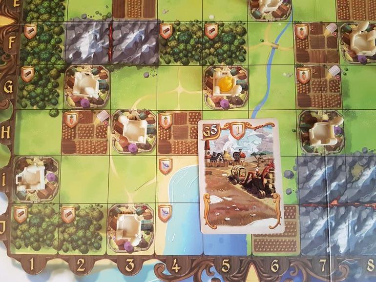 Начинаем партию. Вот первый игрок забрал себе 2 карты - одну карту территории, чтобы поставить на поле своего кролика, а вторую карту постройки с грибной фермой (позже эту ферму можно будет выложить как раз на клетку, обозначенную на первой карте).