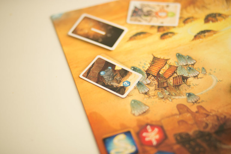 6. Рядом с игровым полем кладем рубашкой вниз 3 карты реликвий и рубашкой вверх колоду из 4 карт артефактов .
