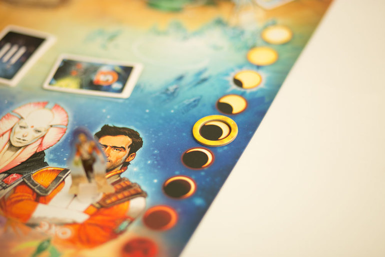 Мы уже собаку съели на поражении по пункту кризиса луны. Поэтому были внимательнее и до выхода красной карты сумели поднять маркер на счетчике затмения до максимума. Кстати, маркер затмения луны своим особым свойством может поднимать на один пункт вверх хрупкая Эли.