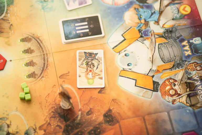 В игровой зоне, на наше счастье только один слишком опасный монстр, дающий аж два пункта падения по шкале затмения. Итак, суммируем все красные значки на всех картах открытых монстров, получаем четверочку. Наш маркер падает на 4 пункта, но не в бездну, фух, пережили!