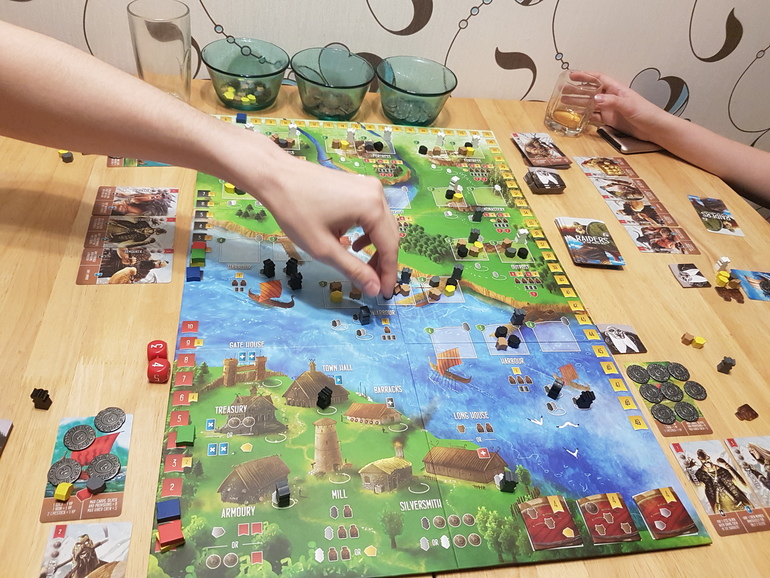 Игра конфликтна. Есть карты, которые позволяют забирать те или иные ресурсы у оппонентов, заставляют их сбрасывать нужные карты. Из-за этого зевать нельзя. Накопил провизии для набега, быстро в поход, пока конкуренту не пришла карта воровства. Но при этом конфликтность легко регулируется. Играешь с детьми, просто перестаёшь использовать правые стороны карт. В общем есть место и подумать немного, и рискнуть с кубиками, и подрезать противника.