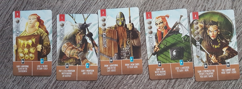 Соратников набираем из увесистой стопки карт персонажей с множеством уникальных иллюстраций. Рисовка персонажей забавная. Банда получается весьма колоритная. Каждый имеет военную силу, которая учитывается при набегах и стоимость найма. Слева действие, если персонаж нанят, справа, если действие однократное, после идёт в сброс. И вот тут то якобы языконезависимая игра становится резко языкозависимой, так как свойства персонажей могут принести значительные плюшки. Вариант "получите 2 ПО при захвате монастыря" я способна понять. Но там есть такие заковыристые формулировки, что без знания языка не разберёшь. Первую игру я была уверена, что мне не везёт с картами, оказалось, неправильно поняла свойства своих персонажей.