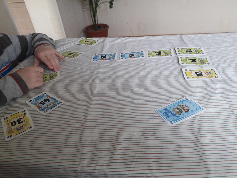 В нашем случае Саня играет взакрытую, мы устраиваемся на кухне у бабушки, где есть обеденный уголок. Там на скамье сын раскладывает все свои карты так, чтобы я не видела. Я принципиально не смотрю. Т.е. не знаю, какие у него карты и как он будет строить маршрут. Иногда он советуется, как охватить больше городов, куда пойти. Мы вместе водим пальцем и прикидываем варианты, но готовых решений я не даю. Учу водить, запоминать карту, размышлять. В игре, как я уже говорила, многое засисит от выхода карт, так что рандом вполне позволяет выиграть неопытному игроку.
