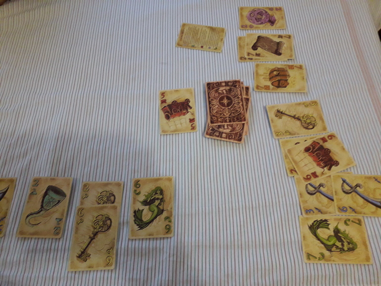 Ещё одна карточная игра-азартная "Карта сокровищ". Push your luck,т.е. "испытай судьбу". Выкладываешь карту, выполняешь её свойство. Задача-не повторить карту в ряду, иначе весь ряд будет отправлен в сброс, а ты не получишь ПО. Можно строить козни, отправляя карты соперника в сброс, так что не для обидчивых.