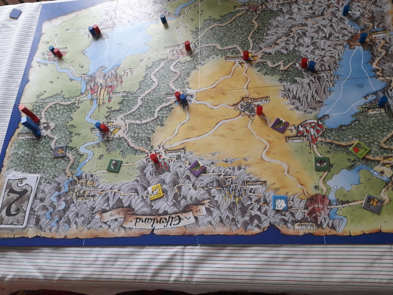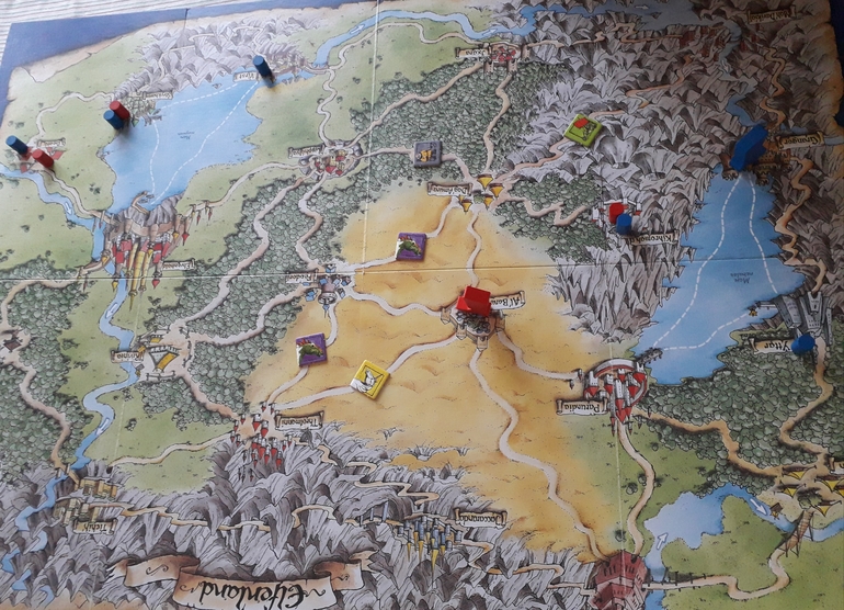 Легенда: эльфы, для того, чтобы считаться взрослыми, совершают путешествия по своей стране, посещая города. Игроки перемещаются по карте, собирая плашки своего цвета в каждом городе.