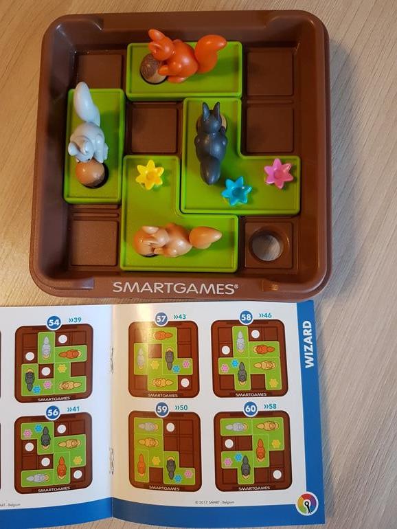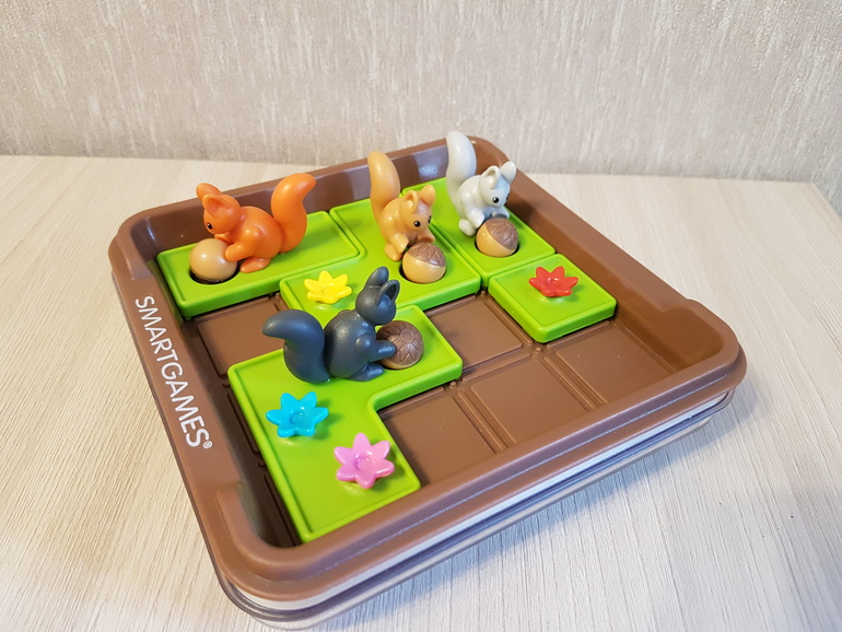Задания пяти уровней сложности, по 12 шт.в каждом. Мне нравится, что есть крышка - при игре она ставится под поле, чтобы не растерялись орешки, а после закрывает поле вместе с белочками. Поэтому хранить можно без картонной коробки.