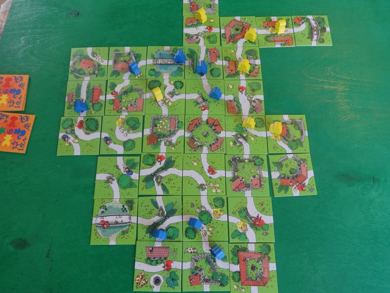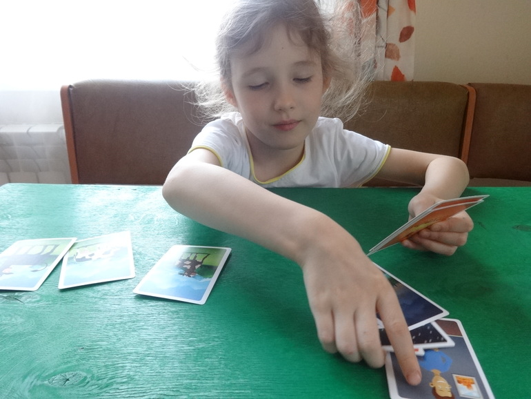 А неплохая игра, больше нравится почему- то мне) Вообще мнение о Каркассоне ( и взрослом и детском) я кардинально поменяла. Отличный филлер, с течением времени играется всё бодрее и чаще, не зря у него столько фанатов. Победила Яна, но с бооольшой моей помощью, не работают у неё почему- то мозги в этом направлении: