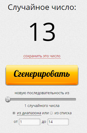 А теперь давайте определим с помощью генератора случайных чисел к кому отправится приз. Обзоров у нас 14, итак...