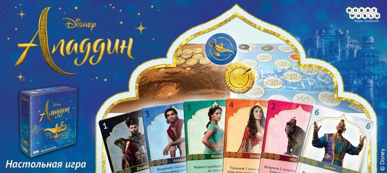 В настольной игре «Аладдин» герои знаменитой сказки помогут вам заработать очки славы и набрать сокровищ, но выбрать можно только одного из шести персонажей. Вместе с героями фильма «Аладдин» вы окажетесь в волшебном городе Аграба и почувствуете атмосферу сказок «Тысяча и одной ночи». Каждый ход игроки разыгрывают карты героев, которые позволяют им получать сокровища и очки славы. Игра заканчивается, когда хотя бы один игрок набрал 15 очков. Победителем становится тот, у кого больше всех очков славы».