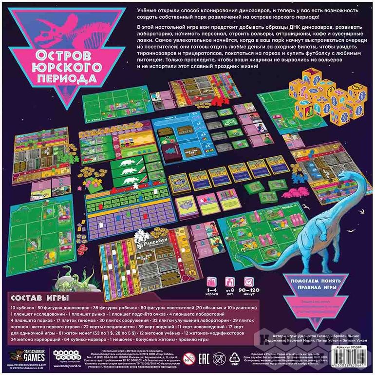 В настольной игре «Остров юрского периода» вы возьмёте на себя роли управляющих парками развлечений на острове динозавров. Вам предстоит непростая задача - вернуть в современный мир необыкновенных существ юрского, триасового и мелового периодов. При этом нужно постараться сделать ваш парк больше и лучше, чем у конкурентов! Но это не так-то просто! Вам придётся нанимать квалифицированный персонал, следить за конкурентами и выхватывать у них из-под носа технологии создания самых популярных динозавров.