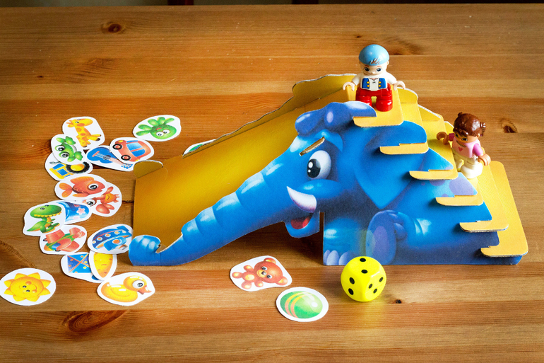 2. Синий слоник. Игра от которой я ожидала очень многого. Но что-то пошло не так. Младшему очень понравилась сама горка и это и испортило нам игру. Он просто использует горку по назначению: катает человечков) И играть не соглашается по другому. Периодически достаю Слоника, но воз и ныне там.