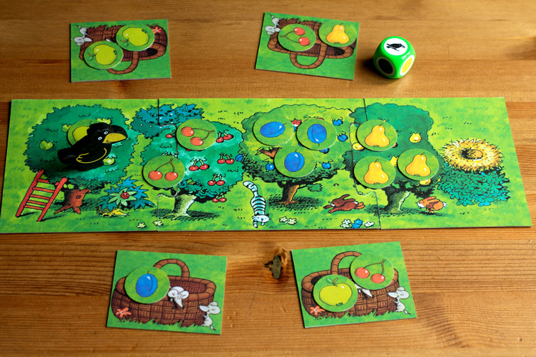 Каркуша: Развиваем память: фрукты раскладываются в закрытую. Нужно открыть такой же что и выпал на кубике. Цель собрать фрукты быстрее, чем ворона доберется до них.