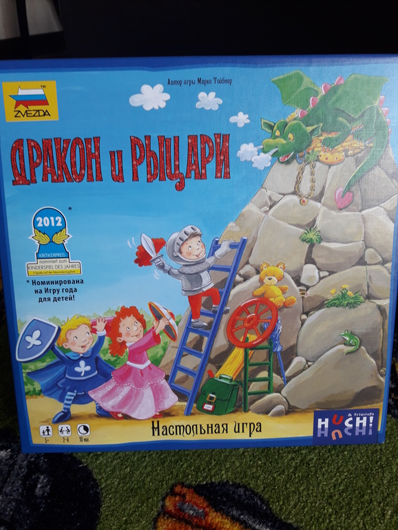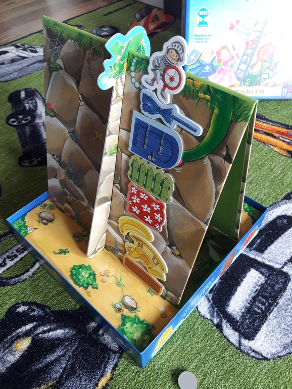Очень понравилась когда-то игра, но сын не справляется, поэтому пока убрала её. С первого взгляда все легко и просто, но не тут то было. На кубике выпадает цвет того предмета из которого вы будете строить лесенку через стену сокровищницы дракона, но в ходе строительства вам может помешать камень сброшенный соперниками на ваш нелёгкий труд. Строительство заканчивается если ваш рыцарь или принцесса(такая тоже имеется) первыми могут заглянуть через стену и тогда вы являетесь победителем. В нашем экземпляре есть небольшой брак, есть оранжевые предметы, а вот оранжевого цвета на кубике нет, играем пока так.