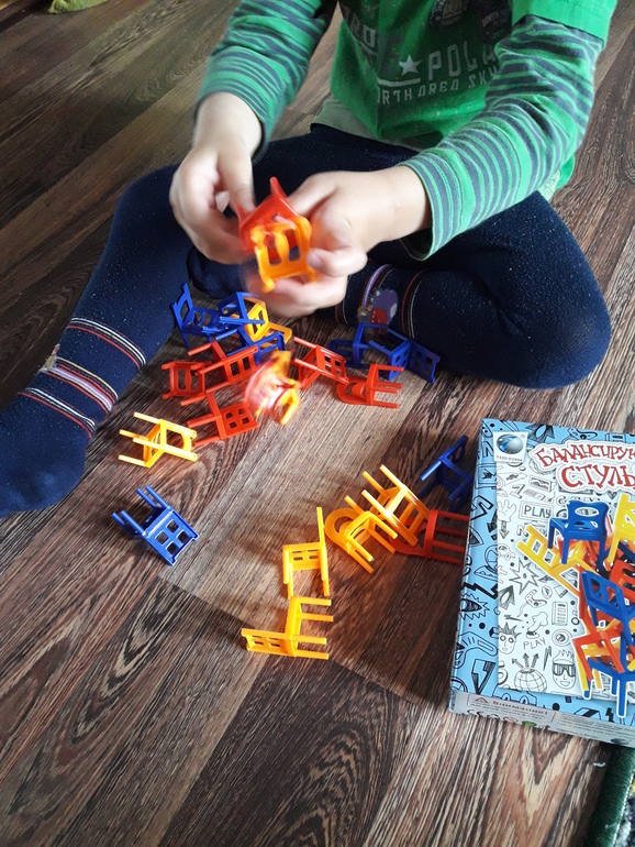 Детям пока не показывала, думаю моим точно рано. Компактный балансир в компактной коробочке. Фигурки устанавливаются одна поверх другой по заданным правилам, либо одного цвета, либо одной формы. Для отпуска в качестве компактной игры очень даже неплоха.