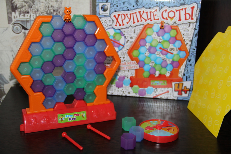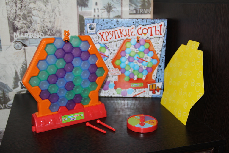 Недавно в сообществе Ирина-модератор рассказывала про неё, забавная игра, но постоянно ползать собирать ее замучаешься, еще хуже отобрать у младшего, если к нему в руки деталь попала. Где-то была у нас аналогичная про Кота на стене, но не нашла, скорее всего к бабушке уехала, так вот что тот кот, что эта пчёлка выглядят очень злыми.