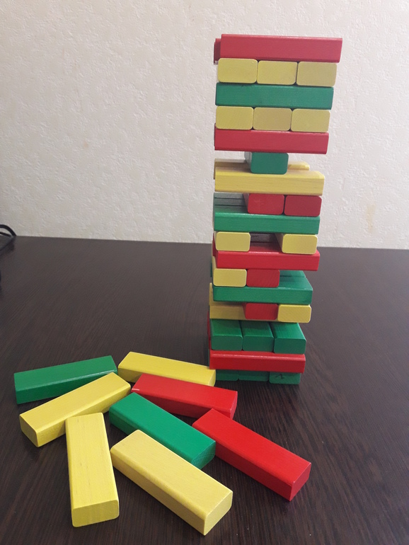 По правилам так ни разу и не играли. К башне прилагается цветной кубик, прокрашена хорошо, но у нас есть сколы кое-где, ввиду активной постройки сыном различных сооружений.